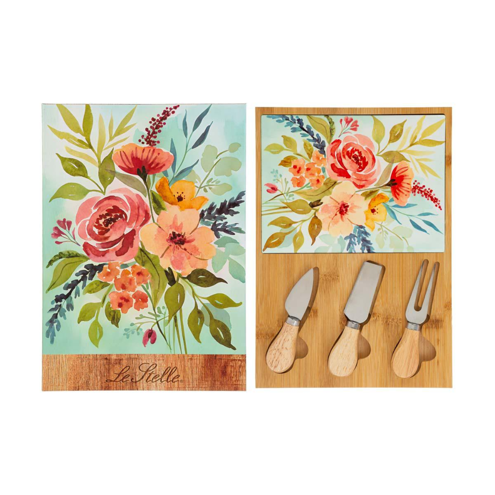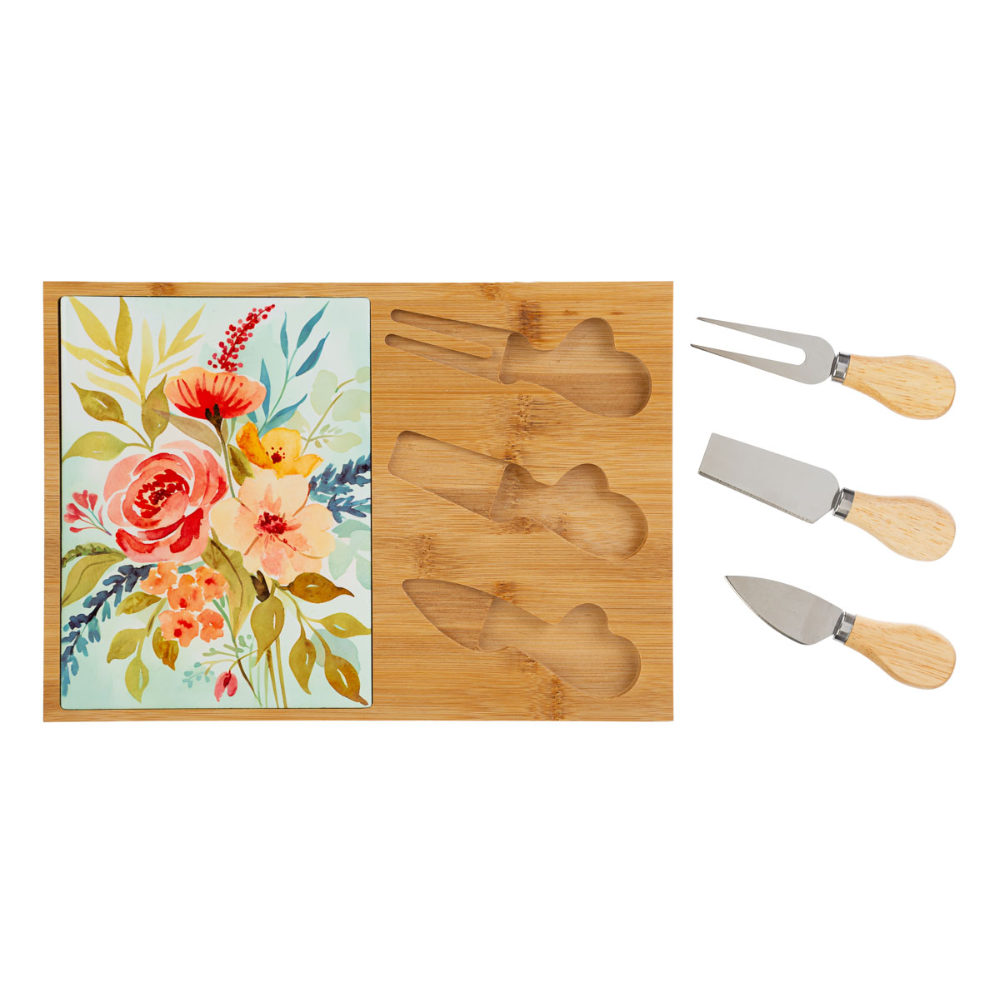 Un’elegante idea bomboniera pensata per rendere ancora più speciale il ricordo del matrimonio. Questo set da quattro pezzi è composto da un tagliere in legno decorato con vivaci motivi floreali e tre pratiche posate per formaggio con manici ergonomici in legno.
