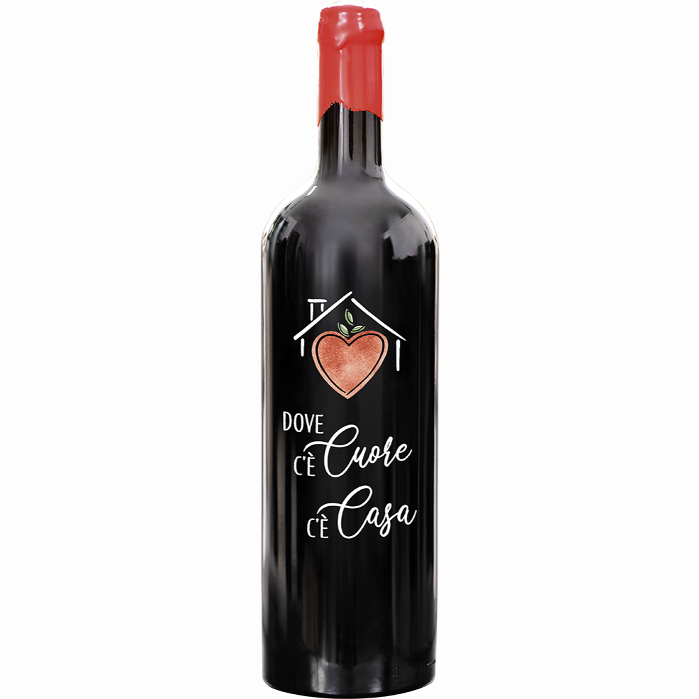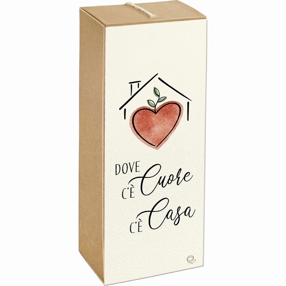 Una scatola regalo dallo stile unico, con coperchio in legno che si trasforma in un originale quadro decorativo, completa di una bottiglia di vino personalizzato.