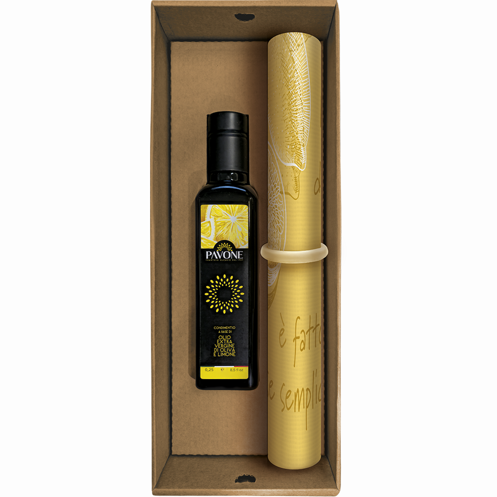 Box pregiato di olio extravergine di oliva e limone accompagnato da una tovaglietta ecopelle, che esalta il piacere della tavola